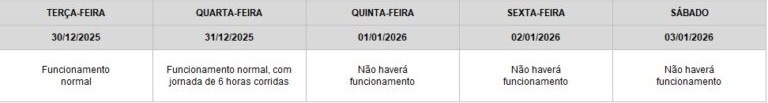 Os Correios terão atendimento por seis horas seguidas, na quarta-feira (31), e as agências estarão fechadas de 1º a 3 de janeiro, como mostra a tabela abaixo: