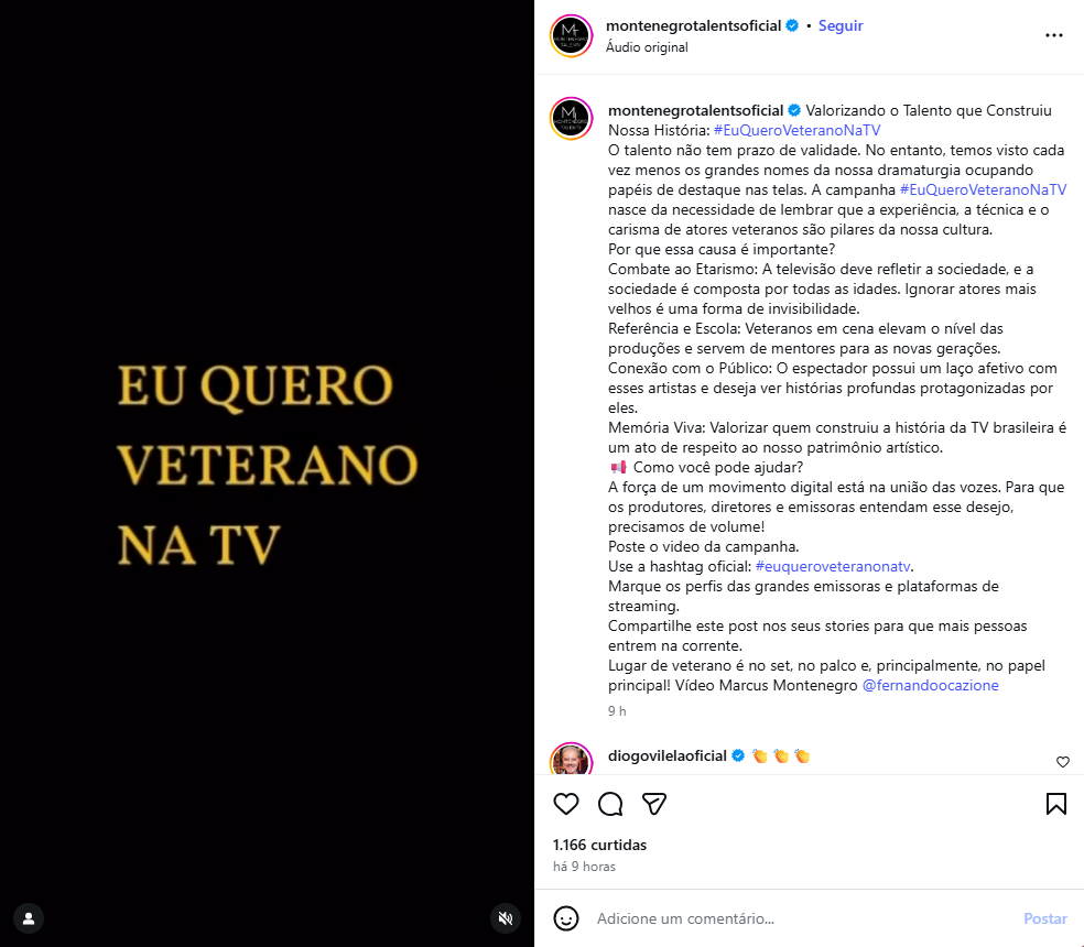“O talento não tem prazo de validade. No entanto, temos visto cada vez menos os grandes nomes da nossa dramaturgia ocupando papéis de destaque nas telas. A campanha #EuQueroVeteranoNaTV nasce da necessidade de lembrar que a experiência, a técnica e o carisma de atores veteranos são pilares da nossa cultura”, destacou Marcus Montenegro através de publicação nas redes sociais.