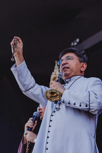 Após a abertura do evento, às 14h30, a multidão de fiéis celebrou junto com o Padre Sandro Santos, seguido pelos padres Puan Ramos, Nilson Nunes, Bruno Costa – da Comunidade Canção Nova. Já era noite quando Frei Gilson subiu ao palco para levar mensagens de fraternidade, amor e esperança. O sacerdote – além de padre e cantor – é um pregador que se tornou fenômeno religioso nas redes sociais, conhecido por suas transmissões ao vivo de orações e por liderar o ministério musical “Som do Monte”. Ele evangeliza através das músicas e pregações, reunindo milhões de seguidores e fiéis em lives, especialmente durante a Quaresma.