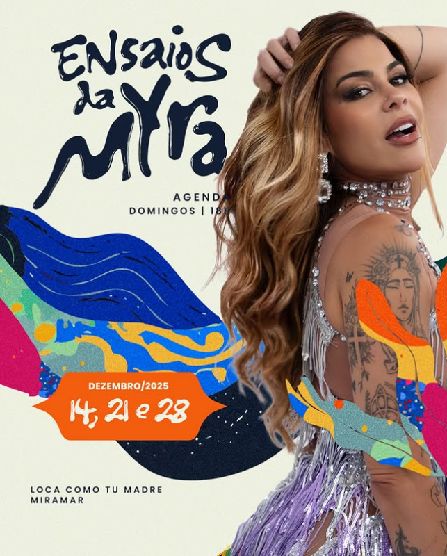Neste domingo (21), às 18h acontece mais uma edição dos “Ensaios de Carnaval” da cantora Myra Maya no Loca Como tu Madre Miramar, em João Pessoa. Desde o verão de 2024, os “Ensaios de Carnaval”, acontece desde o início do mês de novembro e confirmou a força do formato: casa cheia, energia elevada e uma performance que transformou o espaço em um ambiente de celebração.