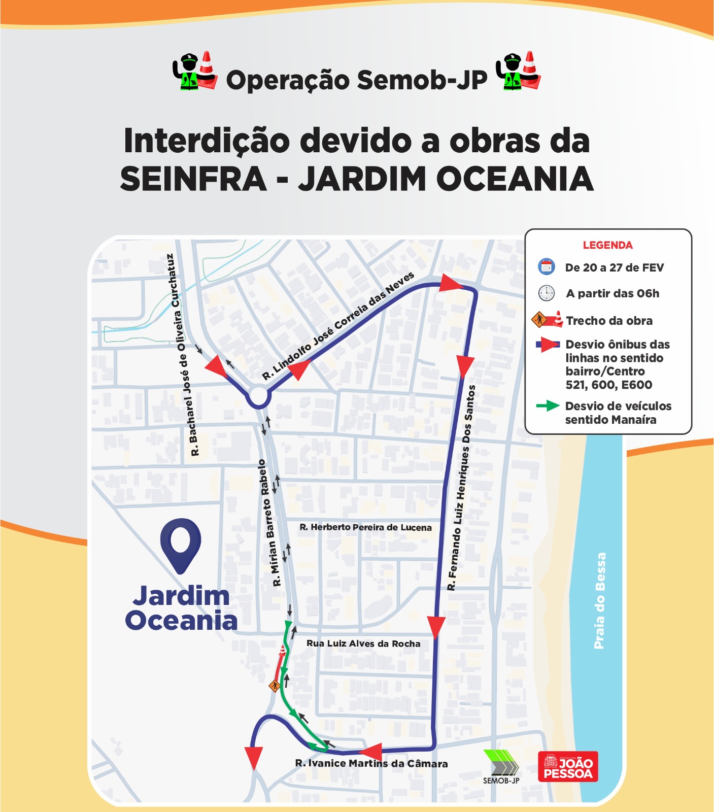 A Semob-JP informou ainda que agentes de mobilidade estarão no local para monitorar o trânsito e orientar motoristas e usuários do transporte público sobre as mudanças temporárias durante a execução dos serviços no Jardim Oceania. A Superintendência recomenda atenção redobrada à sinalização.